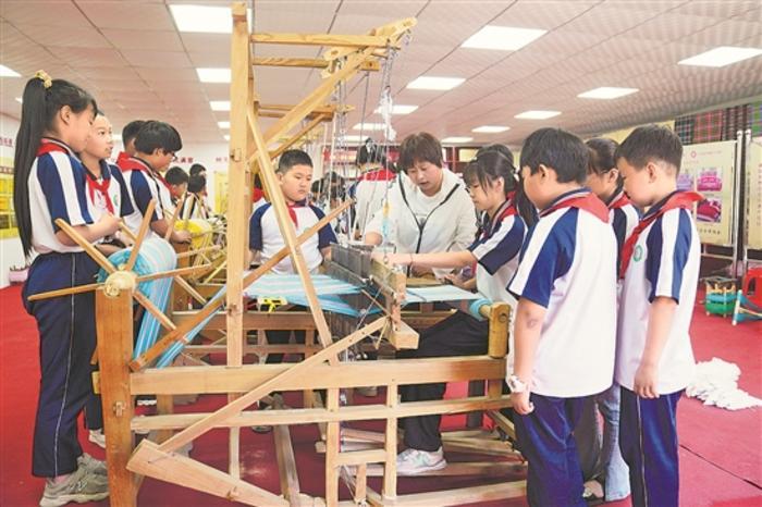 5月24日,小学生在河北省沙河市塔子峪村非遗传习所内体验四匹缯布制作技艺。当日,沙河市组织当地小学生来到非遗传习所,了解沙河四匹缯布制作技艺,感受传统文化的魅力。新华社记者 牟宇 摄