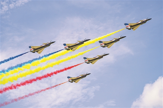 第16届兰卡威国际海事和航空展(海空展)当日在马来西亚旅游胜地兰卡威开幕,中国空军八一飞行表演队上演精彩表演。新华社记者 朱炜 摄