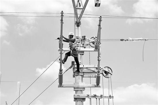 5月23日,在成宜高铁宜宾站,施工人员在架设接触网。