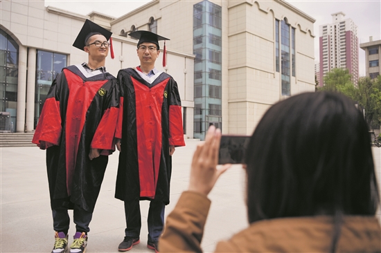 谢炎廷(左)和同学在校园里拍照留念(5月10摄)。