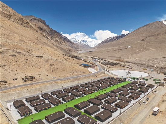 珠峰游客大本营位于西藏日喀则市定日县扎西宗乡。想要观看珠峰日出、日落和星夜的游客们,通常会选择在游客大本营的帐篷旅馆——俗称“牦牛帐篷”过夜。一排排黑牦牛毛编制而成的帐篷,成了珠峰脚下一道独特风景。新华社记者 孙非 摄
