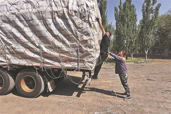5月16日,在新疆昌吉一处棉籽仓库前,等待装货的宋玉兰(图右)帮助装完货的卡友拉篷布。