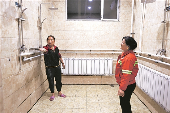 5月19日晚,在内蒙古哈素海服务区司机之家,宋玉兰(图左)在工作人员的引导下来到浴室。穿越数百公里沙漠无人区,她已经一周没有洗过澡。
