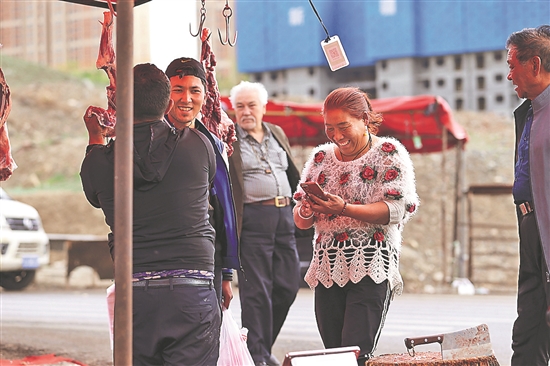 5月15日,宋玉兰(右二)来到新疆乌鲁木齐九鼎批发市场,在卸货间隙买些羊肉准备在路上吃。
