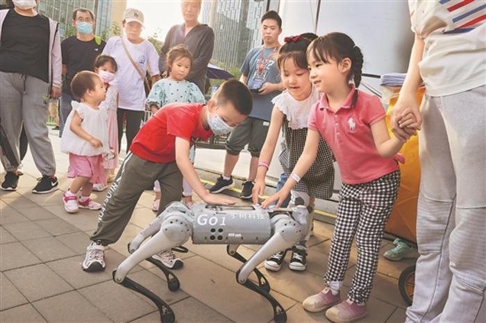 5月28日,2023中关村论坛的配套活动——第四届硬科技嘉年华活动现场,市民带着小朋友与一只机器狗互动。本报记者 吴凡 摄