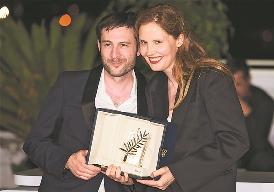 当地时间5月27日,在法国戛纳,法国导演朱斯蒂娜·特里耶(右)展示“金棕榈奖”奖杯。