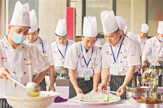 当日,来自全市60余家餐饮行业的110余名厨师各显身手,在中式烹调和中式面点两个项目上烹饪出一道道各具特色的美味佳肴,展示极具地方特色的菜品制作技艺。比赛由淮北市总工会、淮北市人社局等单位联合举办。本报通讯员 张锋 摄
