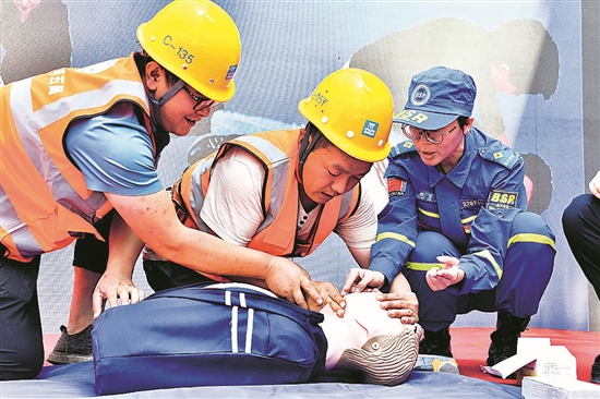 图为蓝天救援队志愿者现场指导农民工掌握心肺复苏应急救援技能。