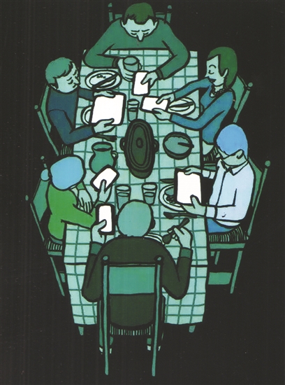 桌上摆着美酒佳肴,就餐者却没有就餐的意思,每个人手里都摆弄着手机或微型电脑,是食不甘味?还是手机太吸引人了?