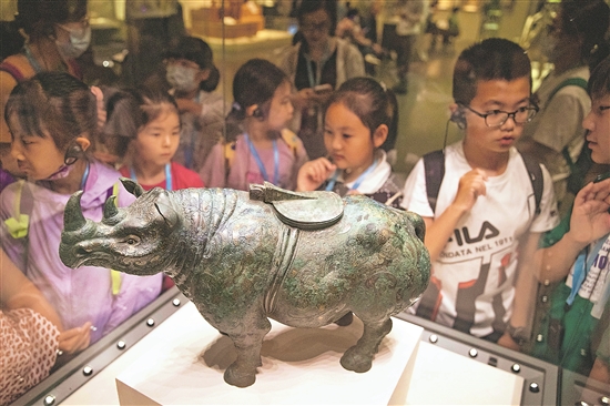 6月1日,观众在中国国家博物馆“古代中国”展厅参观西汉错金银云纹铜犀尊。