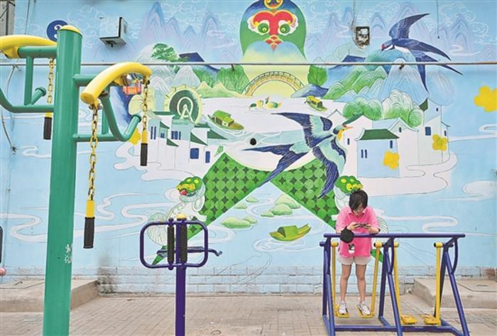 6月4日,市民在宁夏银川市兴庆区教育巷墙绘前健身。近年来,兴庆区特色老街巷改造工程持续推进,截至目前,已维修改造老街巷60余万平方米,打造的一批特色老街巷成为市民和游客休闲旅游的新去处。新华社记者 王鹏 摄