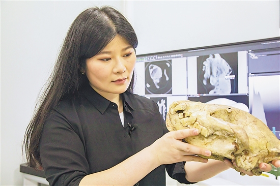图为在位于北京的中国科学院古脊椎动物与古人类研究所,毛方园正在查看动物的头骨化石。本报记者 王伟伟 摄