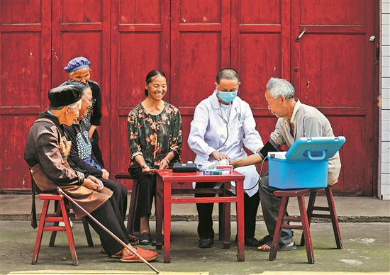 5月31日,贵州省黔西市五里布依族苗族乡中心村的村医罗云,在村民家的院坝里给村民检查身体。