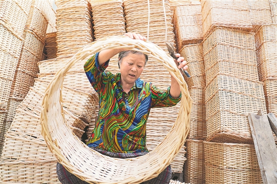6月6日,山东省临沭县青云镇西朱崔村居民在加工点生产柳编产品。