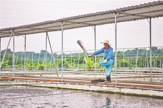6月7日,中国清江(宜都)鲟鱼谷工作人员在给鲟鱼投喂饵料。