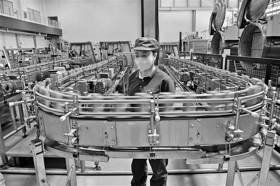 6月6日,在承德县六沟镇一家杏仁深加工企业包装车间,工人在查看生产线运转情况。