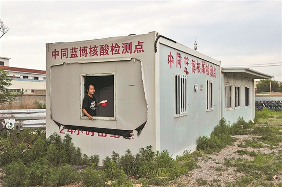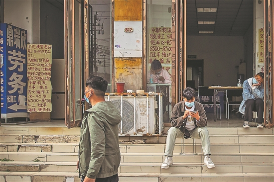 4月13日下午,马驹桥一劳务中介公司工作人员在门口休息。
