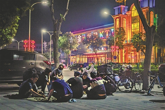 6月3日晚11时47分,几名农民工在路灯下纳凉、下象棋。在路对面是一处灯火通明的娱乐场所。