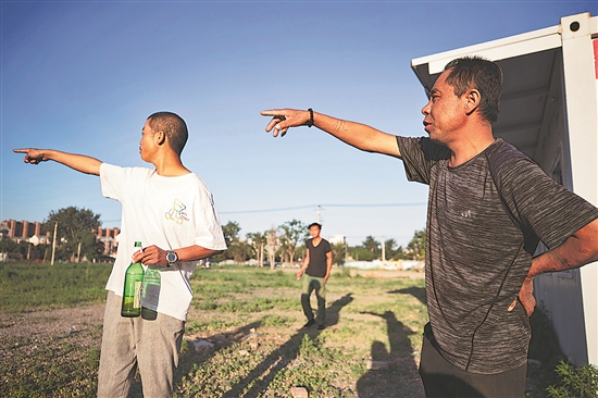 6月9日清晨,在距离兴华中街不远的一处空地上,几名刚睡醒的农民工正在谈论找工作。