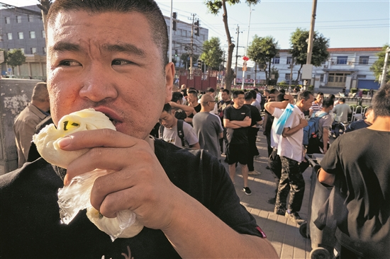 6月6日6时6分,罗勇强在街头一边吃着1.5元一个韭菜鸡蛋馅儿的包子,一边在人群中寻找工作机会。