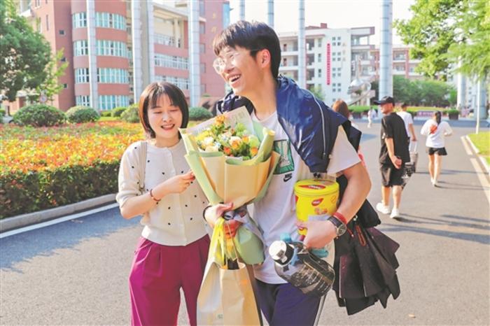 6月10日,在浙江省湖州市德清县第一中学考点,家长给考生送上鲜花。