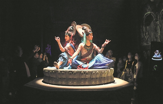 近年来,甘肃省敦煌市依托丰富的文化旅游资源,引进打造了《又见敦煌》《敦煌盛典》《乐动敦煌》等富有敦煌文化特色的经典演艺剧目,不仅丰富了文旅业态,也传承弘扬了敦煌文化。图为日前演员在大型洞窟式沉浸体验剧《乐动敦煌》中表演。
