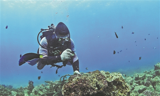 “如果有一天,从海边潜下去,一眼就能看得到珊瑚和鱼群,我的工作就算完成啦。”王丰国笑着说。新华社记者 杨冠宇 摄