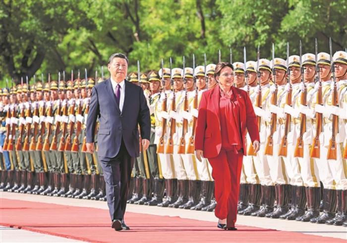 6月12日下午,国家主席习近平在北京人民大会堂同来华进行国事访问的洪都拉斯总统卡斯特罗举行会谈。这是会谈前,习近平在人民大会堂东门外广场为卡斯特罗举行欢迎仪式。