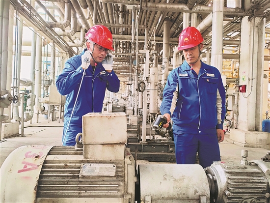 6月6日,抚顺石化工建公司电工二车间南维护班在巡检中及时发现并处理一起电机出口线严重过热的隐患。长期以来,该班组将提升安全意识放在首位,扎实开展常态化安全教育,实施警示教育法、正向励激法、典型引路法,让安全理念深植于心、外化于行。图为班组职工在巡检中“听诊”和测温。