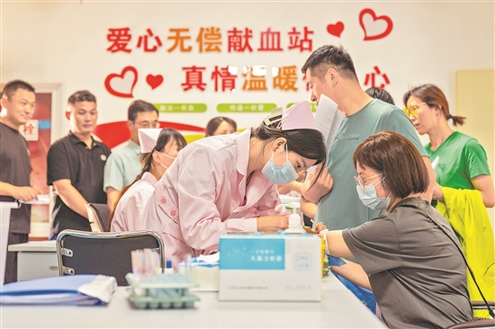 6月14日,市民在安徽省合肥市肥东县血站无偿献血室进行献血前检验。