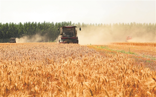 6月14日,山东省邹平市台子镇乡情农业种植合作社在台东村收割小麦。