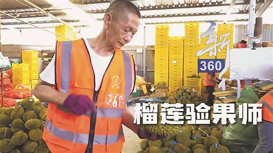 为了保证到消费者手中的榴莲口感最佳、果肉最丰满,65岁的邵一超承担起了“榴莲验果师”的角色,他拿着一根乳胶棒不停敲打榴莲,通过听声音,他能判断手中榴莲的生熟度,经他手的榴莲每天有数千个,发往全国各地。