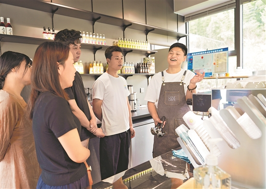 6月15日,在浙江省德清县莫干山镇仙潭美术馆,民宿管家讲师文轩(右)为仙潭村民宿管家进行咖啡制作培训。当日,德清县开展“浙韵千宿”主题民宿培育集中指导交流活动,为民宿主和民宿管家“充电”。据悉,德清莫干山不断发展高端民宿业,催生了这里的新职业——民宿管家,目前全县共有约4000名民宿管家。