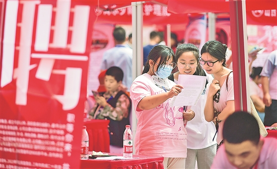 6月15日,毕业生在河南推拿职业学院2023年毕业生就业双选会上查看招聘信息。