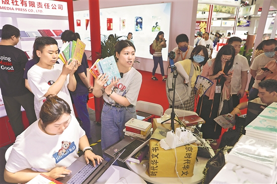 6月15日,北京国际图书博览会现场,参展商在直播带货。