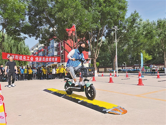 6月16日,由北京市怀柔区总工会、泉河街道总工会联合举办的首届快递员技能竞赛——网约送餐员两轮车驾驶专场决赛在泉河街道航天工程大学社区举行。来自美团、饿了么两家公司的网约送餐员中的40名业务能手走上“比武擂台”一展身手。图为比赛现场。