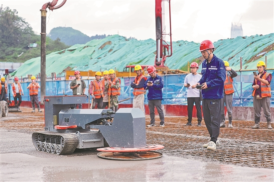 6月16日,在四川省宜宾市翠屏区五新起步广场建设项目现场,智能建筑机器人正在进行混凝土整平、磨平施工。作为四川省首批13个智能建造试点项目之一,首次投用智能建筑机器人,通过智能激光找平算法、巡航技术、线控底盘技术、智能摆臂算法等技术手段,精准高效完成施工。王宇 摄/人民图片