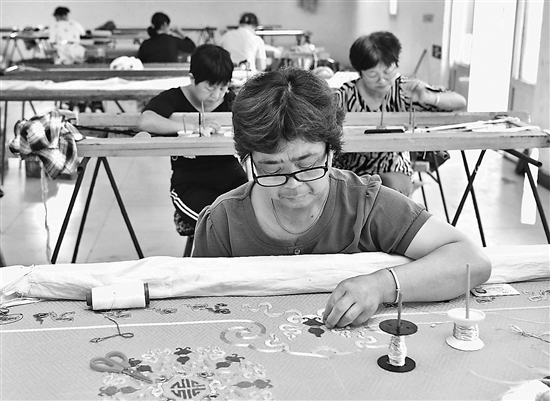 6月13日,河北省肃宁县邵庄乡东高家口村一家戏曲服装厂的工人在绣制戏曲服装。