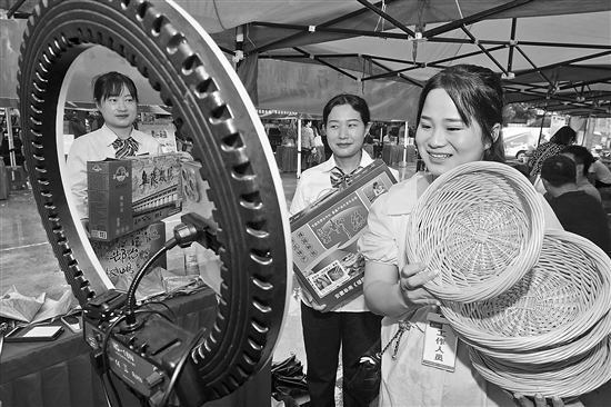 6月18日,安徽阜阳,在阜南县端午民俗文化节暨特色农副产品线上线下展销会现场,阜南邮政分公司的工作人员利用邮乐、抖音平台线上直播推销地方特色农副产品。