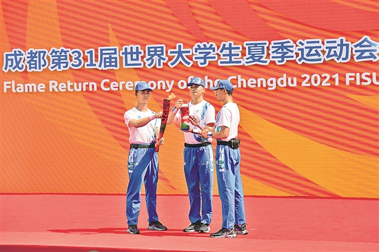 6月20日,护卫队队员在仪式现场收火。 当日,成都第31届世界大学生夏季运动会火炬传递深圳站在深圳大学校园内举行。新华社记者 梁旭 摄