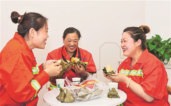 端午节临近,山东省枣庄市市中区总工会开展“粽有意 送真情”活动,购买糯米、蜜枣等食材,组织工会志愿者包粽子,并送给环卫工人、快递员、外卖配送员等户外劳动者,让他们提前感受到浓浓的节日氛围。本报记者 田国垒 本报通讯员 吉喆 摄