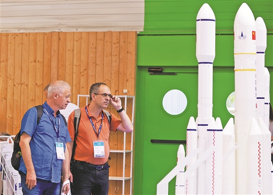 日前,在法国巴黎近郊的布尔歇机场举行的巴黎航展上,参观者关注中国航天科技集团有限公司展出的长征系列运载火箭。当地时间6月19日,第54届巴黎-布尔歇国际航空航天展览会(巴黎航展)在法国巴黎开幕。新华社记者 高静 摄