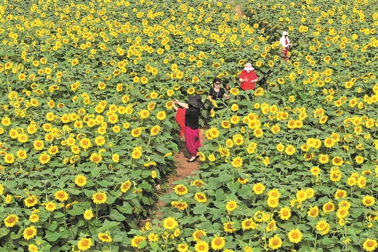 近日,安徽省淮北市相山区渠沟镇张楼村向日葵种植基地的向日葵进入盛花期,金色花海在阳光下绚烂夺目,吸引游客前来观赏游玩。近年来,淮北市相山区坚持农旅融合发展,大力发展生态观光农业,打造集向日葵、芍药、菊花等特色种植和深加工的“芳香小镇”,带动当地村民增收致富,助力乡村振兴。 本报通讯员 万善朝 摄