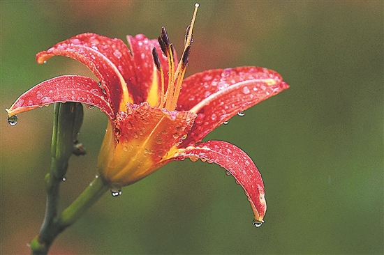 萱草花,又叫忘忧草,是象征母亲的花。图为近日在江苏南通,萱草花在雨中开放。视觉中国供图