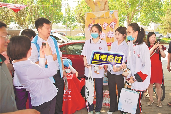 6月24日,北京市朝阳区常营地区总工会联合中铁城建北京公司,在朝阳区陈经纶中学校门外开展“助力中考,为梦护航”志愿服务活动,为考生、考生家长、环卫工、值班民警等提供矿泉水、凉茶、清凉贴、藿香正气水等防暑降温用品。本报记者 赖志凯 本报通讯员 黄继彩 摄