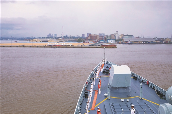 ①中国海军第43批护航编队抵达科特迪瓦阿比让港区。新华社发(吴亢慈 摄)