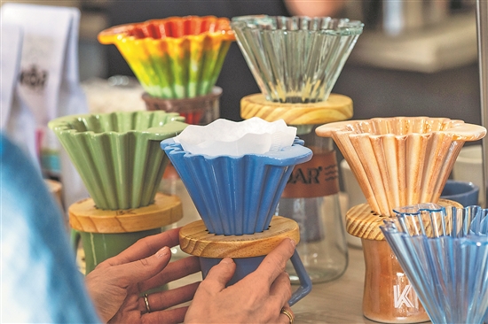 这是当地时间6月23日在巴西圣保罗举行的咖啡节上拍摄的手冲咖啡滤杯。