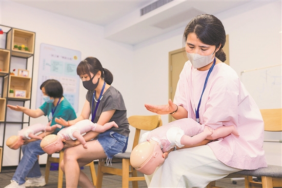 6月25日,浙江省湖州市德清县总工会、县人社局联合康乾街道总工会开展保育员技能竞赛活动,提高职业技能水平,增强就业能力。图为考生正在进行异物窒息海姆立克急救项目的比赛。赵宁 摄/人民图片
