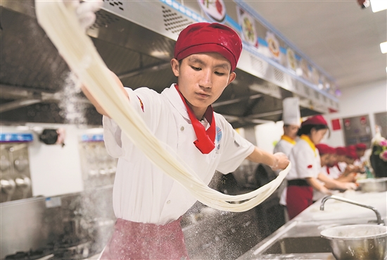 蓝田县是著名的“厨师之乡”。全县现有6万余人从事餐饮行业,足迹遍布全球30多个国家和地区。为进一步发挥蓝田厨师资源优势,培养更多技能人才,蓝田县通过成立公办三年制烹饪专业中等职业教育学校——蓝田厨师学校,培养一专多能的新一代厨师,让具有地方特色的职业教育拓展就业渠道,助力乡村振兴。新华社记者 李一博 摄