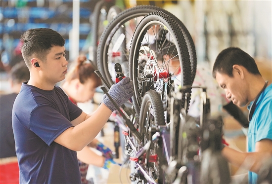 6月25日,工人在唐山市芦台经济开发区一家自行车企业的生产车间工作。